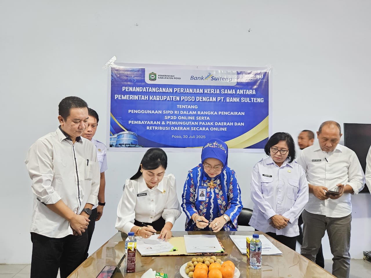 Penandatanganan dilakukan oleh Direktur Utama PT Bank Sulteng, Ramiyatie, dan Sekretaris Daerah Pemkab Poso, Heningsih Tampa, yang mewakili pemerintah daerah. Kerjasama ini merupakan tindak lanjut dari implementasi Sistem Pengelolaan dan Pertanggungjawaban Daerah (SP2D) Online melalui Sistem Informasi Pemerintahan Daerah Republik Indonesia (SIPD-RI), yang sebelumnya telah disepakati pada 17 April 2025 di Jakarta.