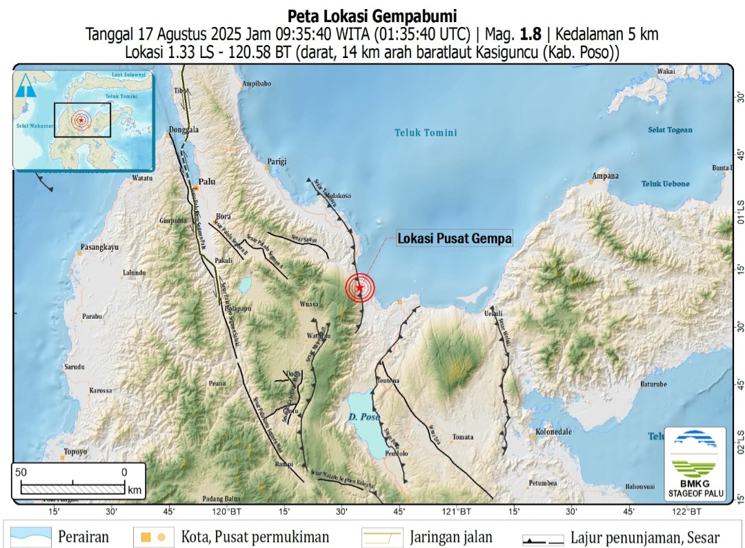 Diksi.net, Poso – Gempa bumi berkekuatan magnitudo 6.0 mengguncang Kabupaten Poso, Sulawesi Tengah, pada Minggu (17/8) pukul 06.38 WITA, menyebabkan 29 orang luka-luka dan ratusan warga terdampak. Badan Penanggulangan Bencana Daerah (BPBD) Sulawesi Tengah melaporkan bahwa Kecamatan Poso Pesisir menjadi wilayah yang paling parah terkena dampak.