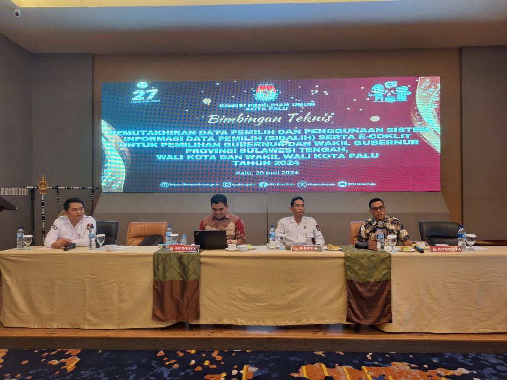 Diksi.net, Palu – Komisi Pemilihan Umum (KPU) Kota Palu menyelenggarakan bimbingan teknis (bimtek) mengenai pemutakhiran data pemilih dan penggunaan Sistem Informasi Data Pemilih (SIDALI) serta E-Coklit. Acara ini bertujuan untuk persiapan pemilihan Gubernur dan Wakil Gubernur Provinsi Sulawesi Tengah serta pemilihan Wali Kota dan Wakil Wali Kota Palu tahun 2024. Kegiatan ini berlangsung di salah satu hotel di Palu pada Kamis (20/6/2024).
