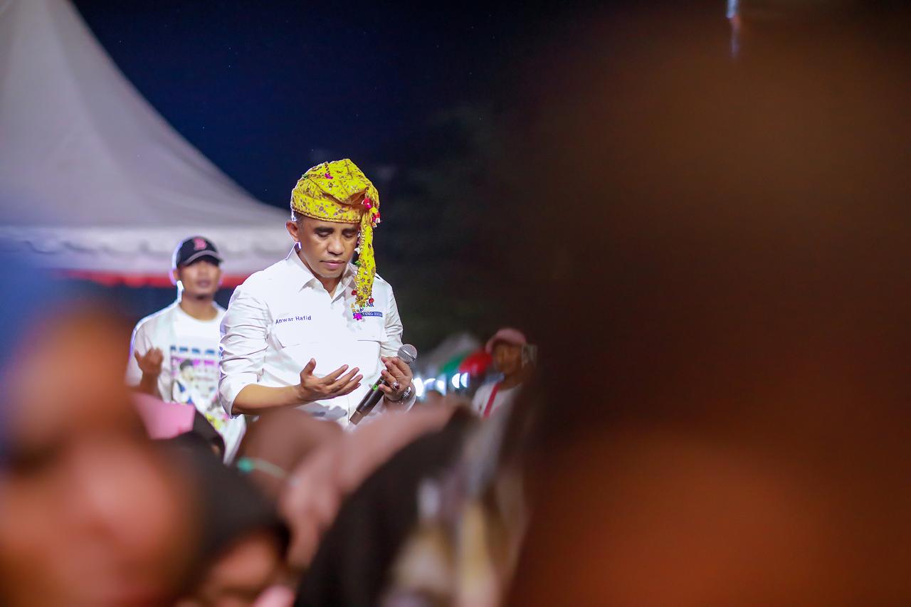 Calon Gubernur Anwar Hafid berdoa di tengah tengah pendukungnya di acara deklarasi relawan BERANI di Kabupaten Parimo Jumat (19/07). (foto : Mad)