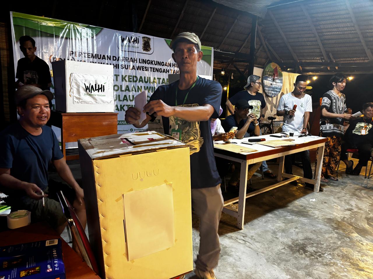 Salah satu anggota lembaga WALHI Sulteng saat memasuk kan surat suara ke kotak suara saat proses pemilihan Eksekutif Daerah dan Dewan Daerah WALHI Sulteng di PDLH ke-IX. (Foto : Andi Syaifullah).